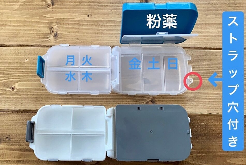 ケースを開けると左側が4仕切、右側が3仕切と、粉薬用が1つあります。そしてストラップ用の穴まで付いています!