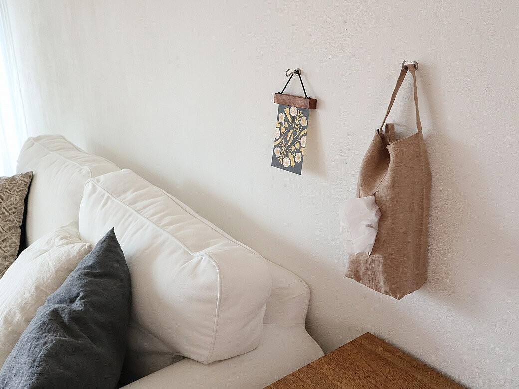 吊るせるティッシュケースなら、サイドテーブルなどがなくても、壁に画鋲をさすだけで簡単にティッシュの定位置を作ることができるんです。