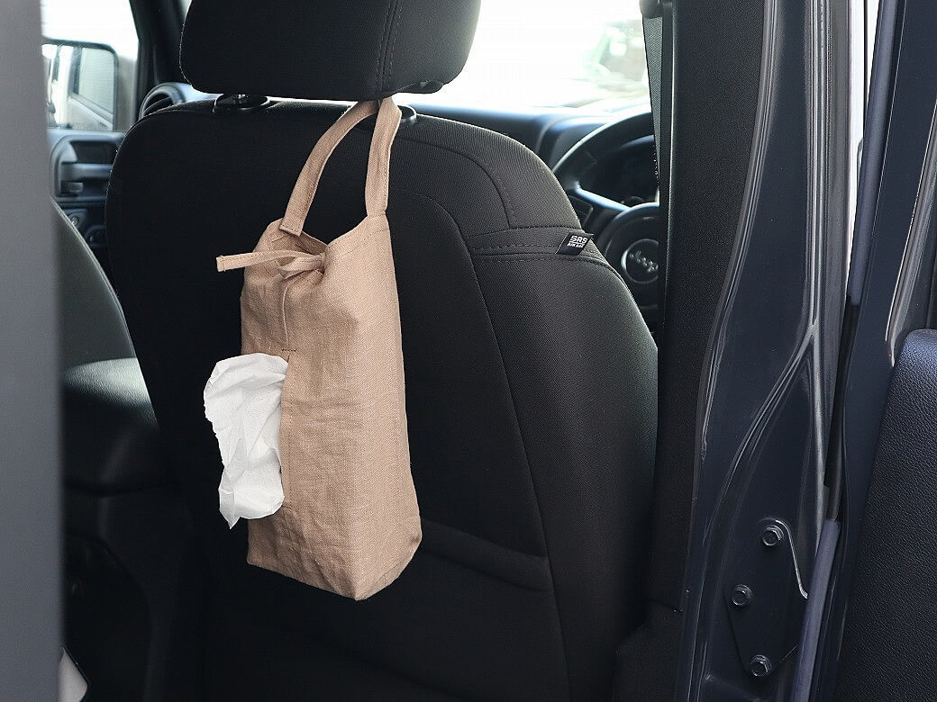 吊るせるティッシュケースといえば、やっぱり車使い。ヘッドレスト部分に吊り下げておくことができますよ。