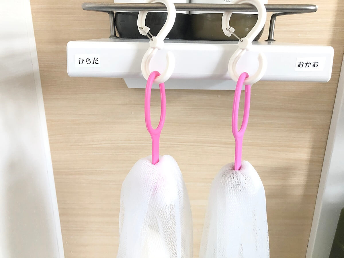 石鹸を使用するときは、S字フックから外して片手で持ち、もう片方の手でくるくるとネットを石鹸にこすり合わせて泡立てて使用します。