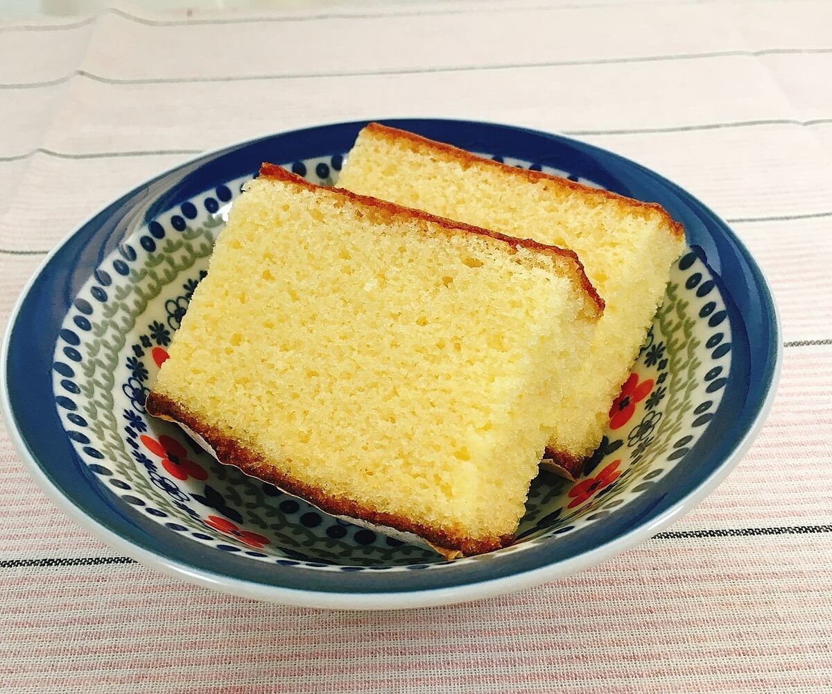 ちょっと物足りないなぁとふとお皿を見ると、カステラの底の部分がへばりついているではありませんか!それを、フォークですくって食べると上品の柚子の味が。