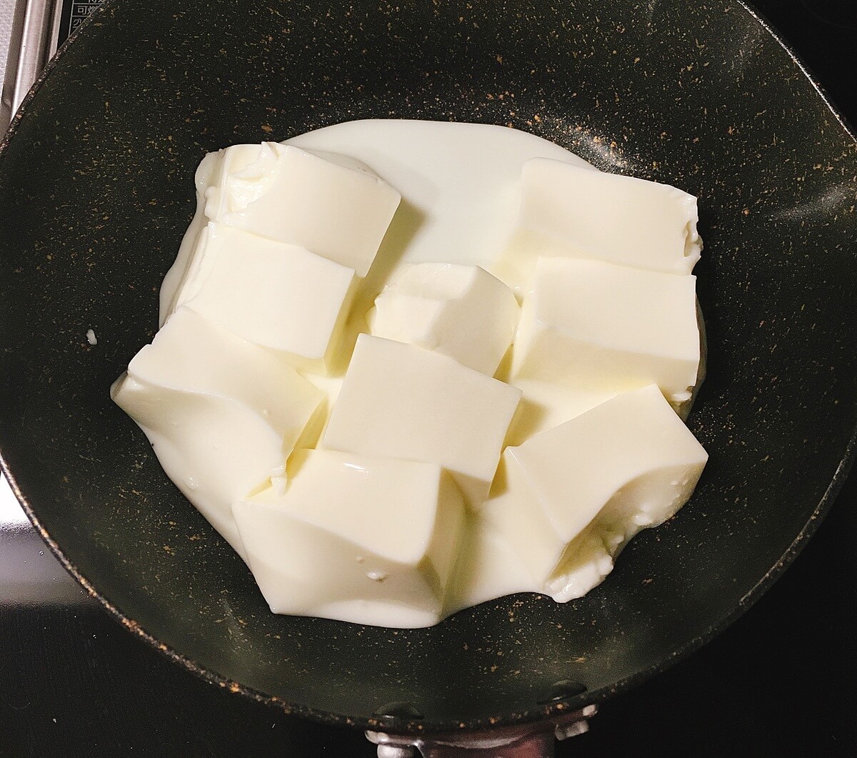 そのままと書いていましたが、早く液化するようにカットしました。完全に豆腐です。麻婆豆腐でも作っている気分に。笑。