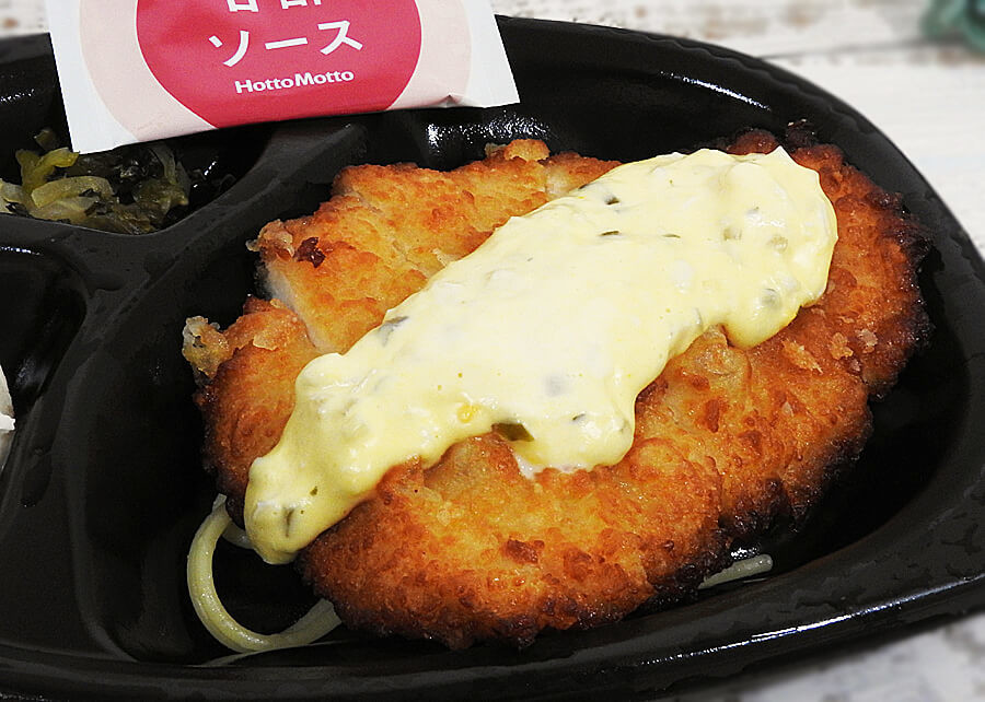 鶏の胸肉を使ったチキン南蛮とタルタルソースがたっぷりとのったほっともっと「チキン南蛮 おかずのみ」。ハッピーアワー時 370円(税込)で甘酢ソースもついています。