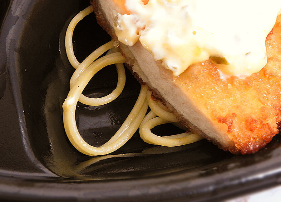 チキン南蛮の下には、お弁当を買うとよくみかけるパスタが。