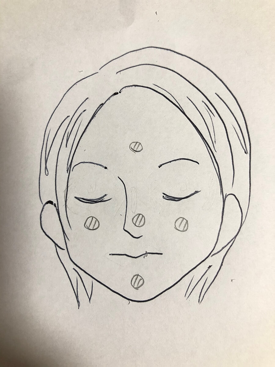 左頬、右頬、額、鼻、顎につけてから、全体に伸ばしましょう。いつもより少量なのに顔全体をカバーできますよ。