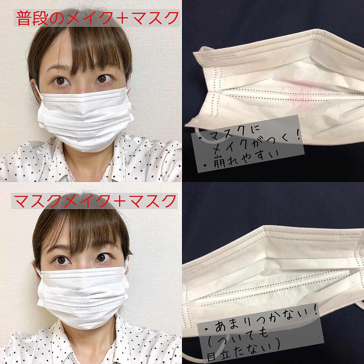 また普段のメイクにマスクを重ねると、メイクが崩れやすく、マスク裏にばっちりメイクがついてしまうことも。ランチ後など、メイクがばっちりついたマスクをつけ直すのは萎えますよね。