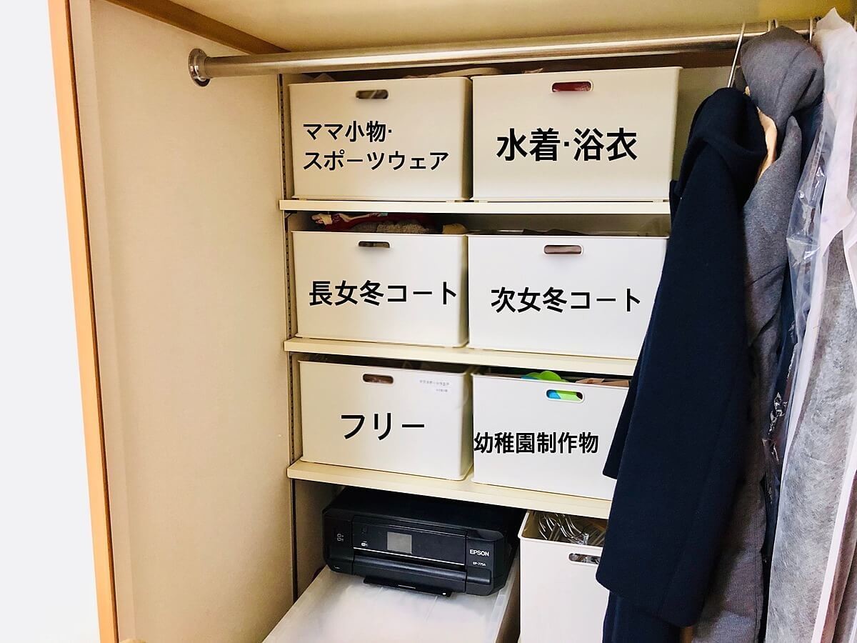 手前に洋服をかけていて取り出しにくいこともあり、ここのNインボックスには水着や浴衣、子ども用コートなどの季節物など、頻繁には使用しないモノを収納しています。