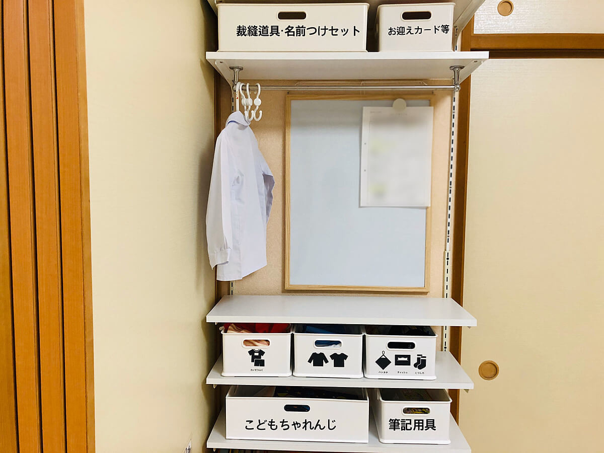 この押入れはリビング横にあって、子どもの着替えと親の着替えが一緒にできたり、子どものお出かけ用品も一緒に収納していて、お出かけの準備も全てここでできるので、とても便利な場所になりました。