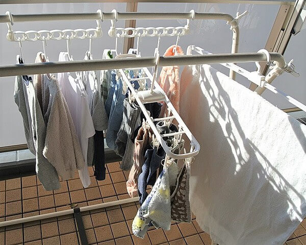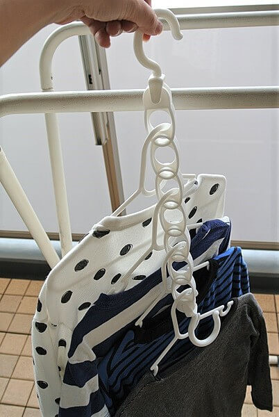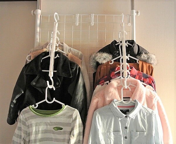 洗濯物をこのまま片方のフックを引っ掛ければ、省スペースに収納できます。