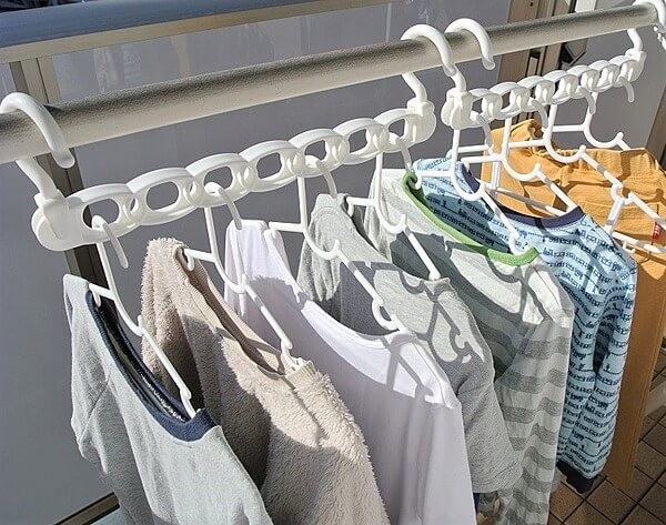 この7連ハンガーに洗濯ハンガーをかけると、風でハンガーが片寄るのを防いでくれます。
