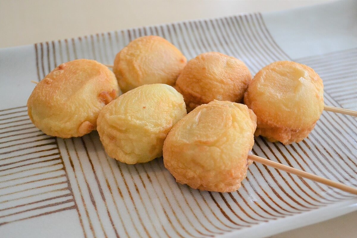 今回は1つずつ衣にからめて、揚げた後に串に刺してみました。