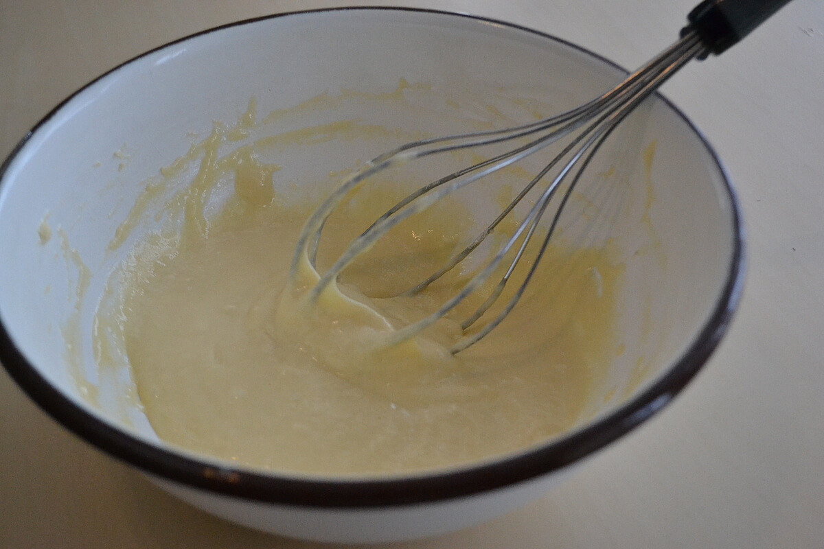 分量とかはあまり気にせず(笑)。強力粉を半カップくらいボールに入れて卵を割り入れます。バターを適量入れてから、混ぜながら牛乳を少しず加えて固さを調整しましょう。
