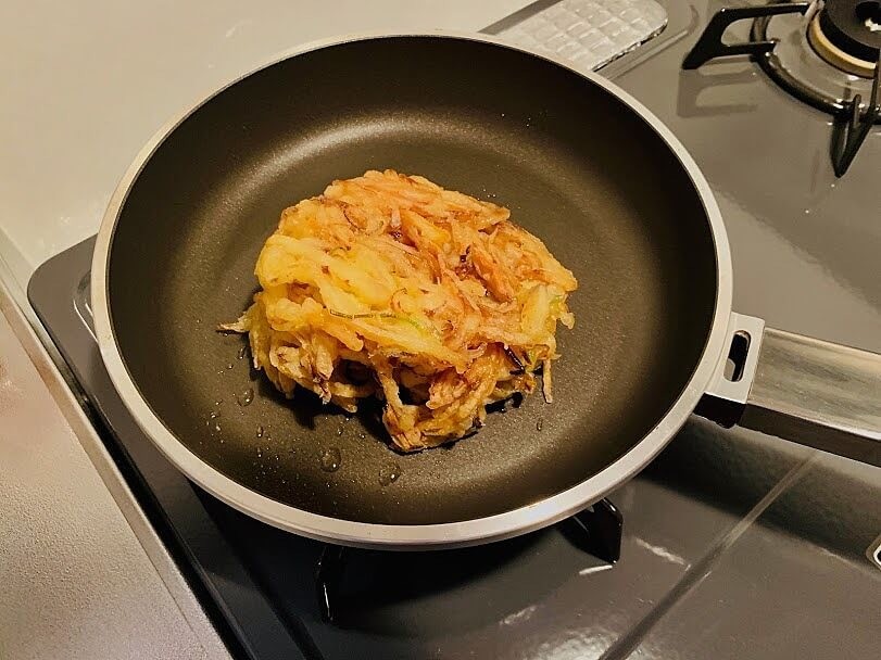 熱したフライパンに油は敷かず、そのままかき揚げを入れます。