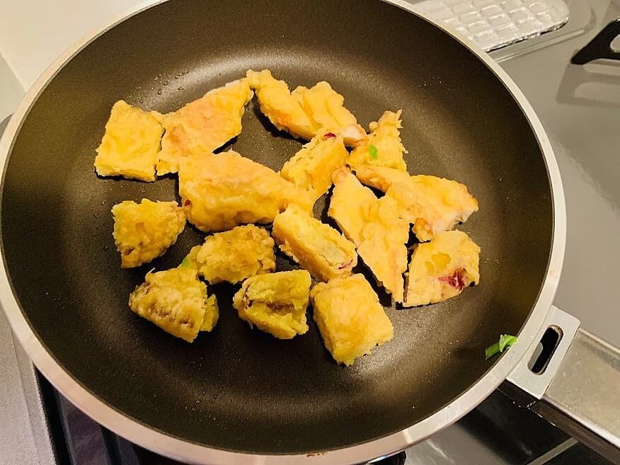 ちくわ天とさつまいも天を適当な大きさに切って、油を敷かずに温めます。