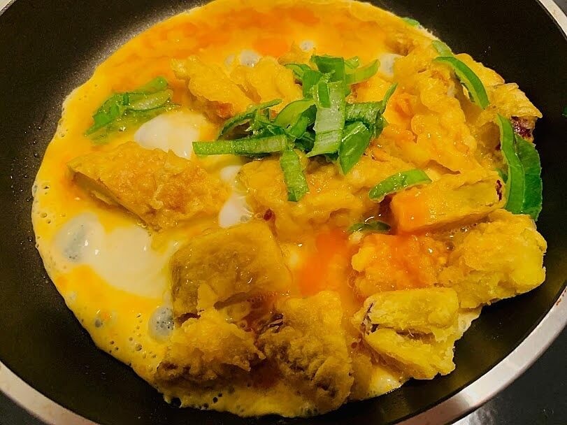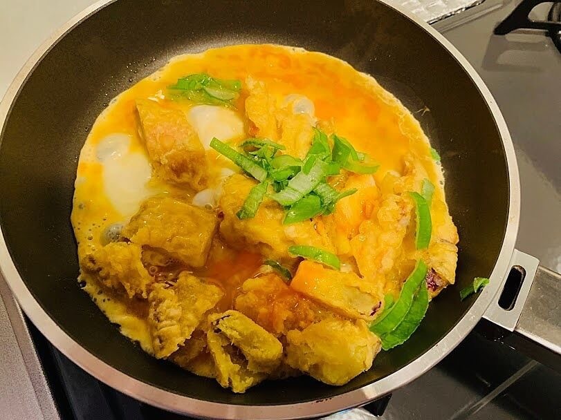 白だしなどで味付けをした卵液を投入します!ちょっと多め・ゆるめの方がとじやすいですよ。彩りにネギも乗せました。