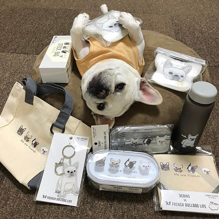 2020年3月31日、満を持して発売された「3COINS × FRENCH BULLDOG LIFE」のコラボアイテム。14,000通もの応募のなかから選ばれた4匹のフレンチブルドックをモデルに、全12種類のアイテムがラインアップされています。