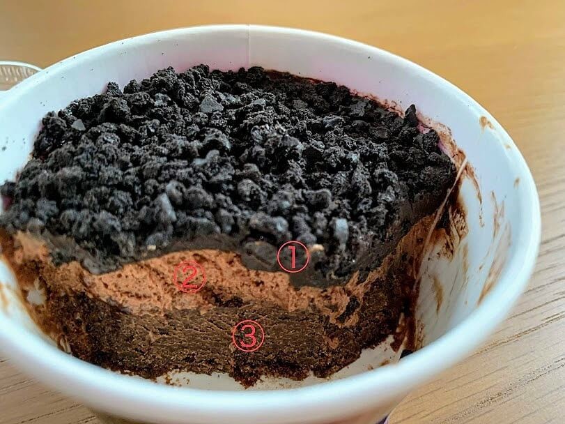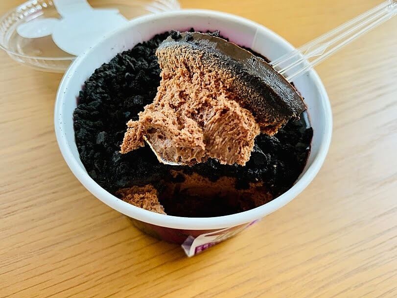 チョコレートだけど、茶色というより黒に近いです。それだけ濃厚ということです。チョコビスケットがこれでもかというくらいかかっています。