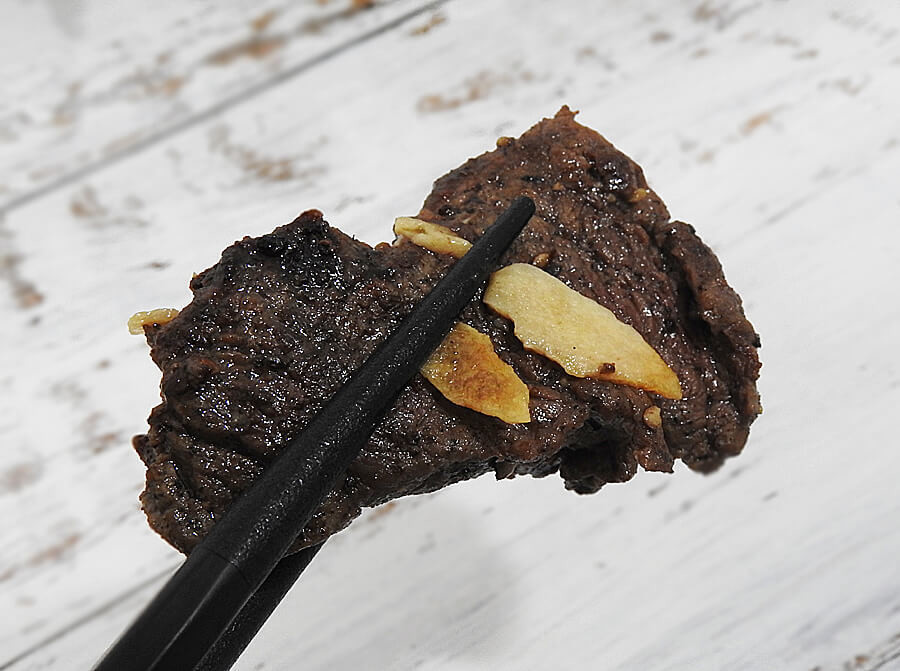 ステーキは一口大~二口程度にカットされています。「ステーキはかたいからちょっと苦手」という人もいらっしゃると思いますが、いきなりステーキの「乱切りカットステーキ」は比較的噛み切りやすくて、食べやすいと思います。