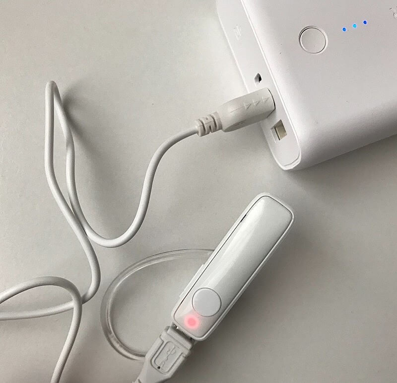 充電時は赤色のライトが点灯。青色になれば充電完了です(初めて使用する時は約2時間充電してください)。