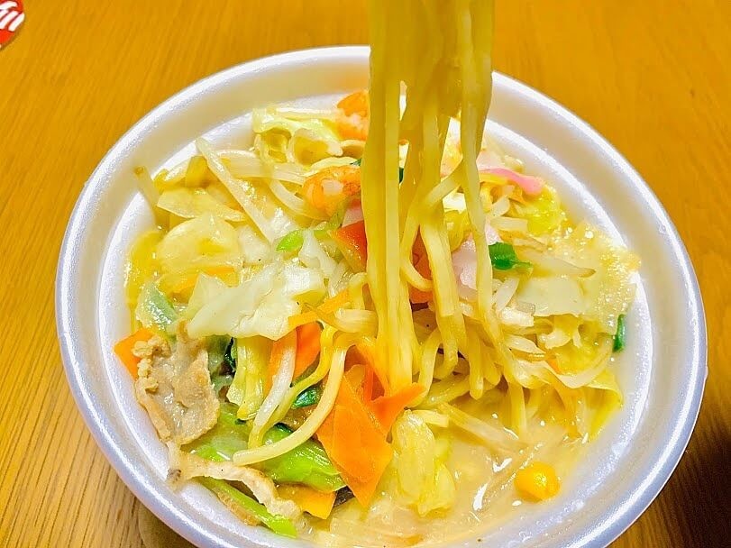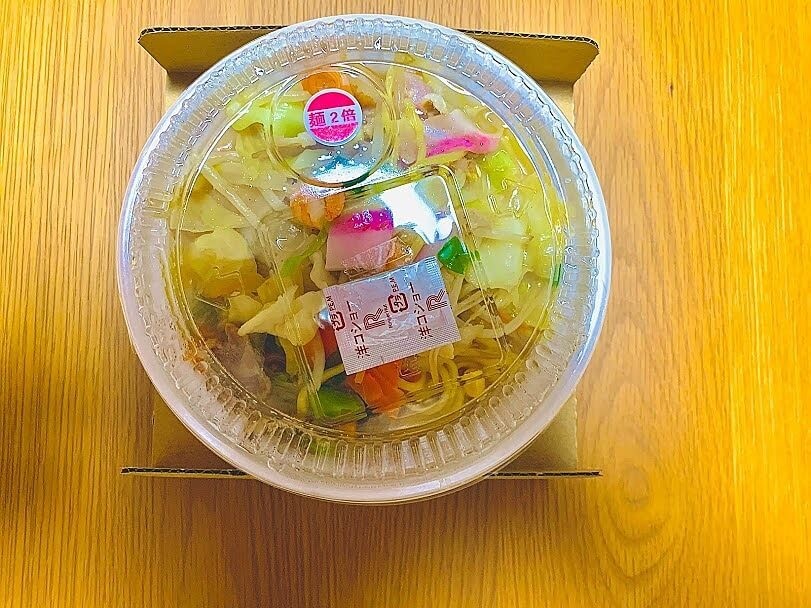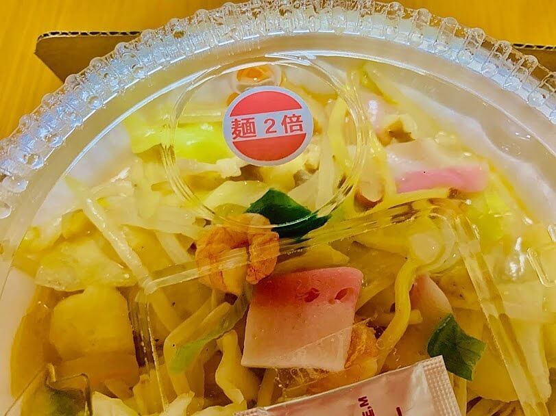 キャベツやニンジン、豚肉やかまぼこなど、店内で提供される時と同じ具材です。なんとなく、店内で食べる時よりも野菜が多く感じました。たぶん気のせいだとは思うのですが。