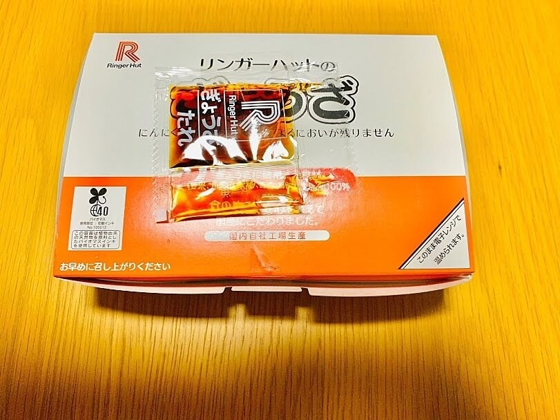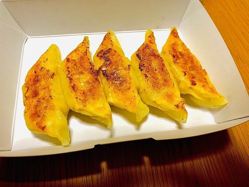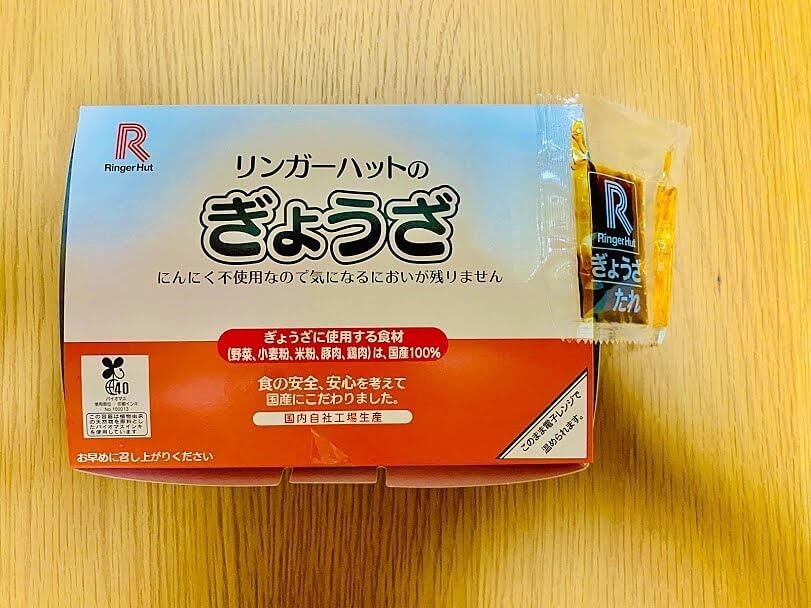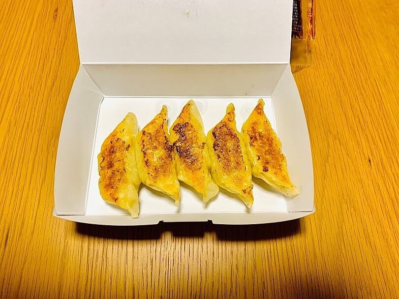 続きまして薄皮ぎょうざ5個入りです。ぎょうざのたれとラー油は箱に貼り付けられて提供されます。