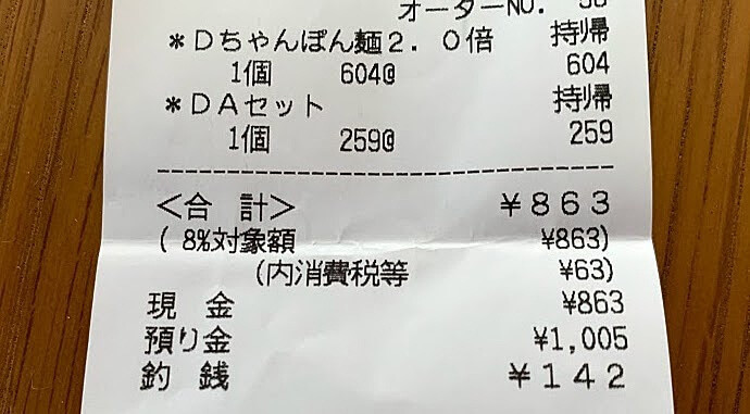 リンガーハットのホームページを見ますと、長崎ちゃんぽんと薄皮ぎょうざ5個セットで896円(税込)とありましたが、購入時には863円(税込)でした。