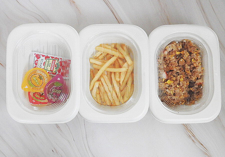 チャーハンの他には、フライドポテトとゼリー3個がついていました。「未就学児の子ども1人分としては多すぎだけど、2人分にしてはちょっと少ない」といった量でしたね。