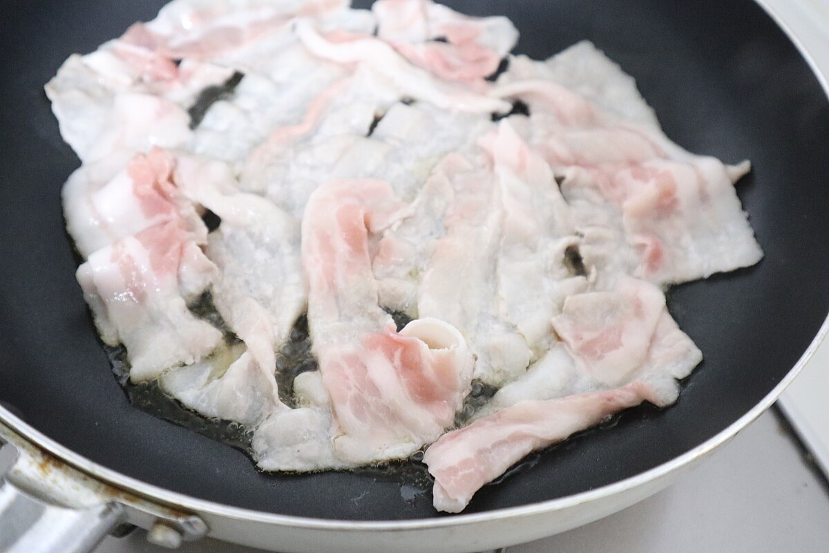 1、フライパンにごま油をしき中火で熱し、重ならないよう豚肉を並べる。