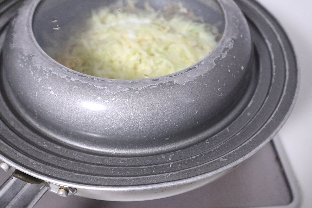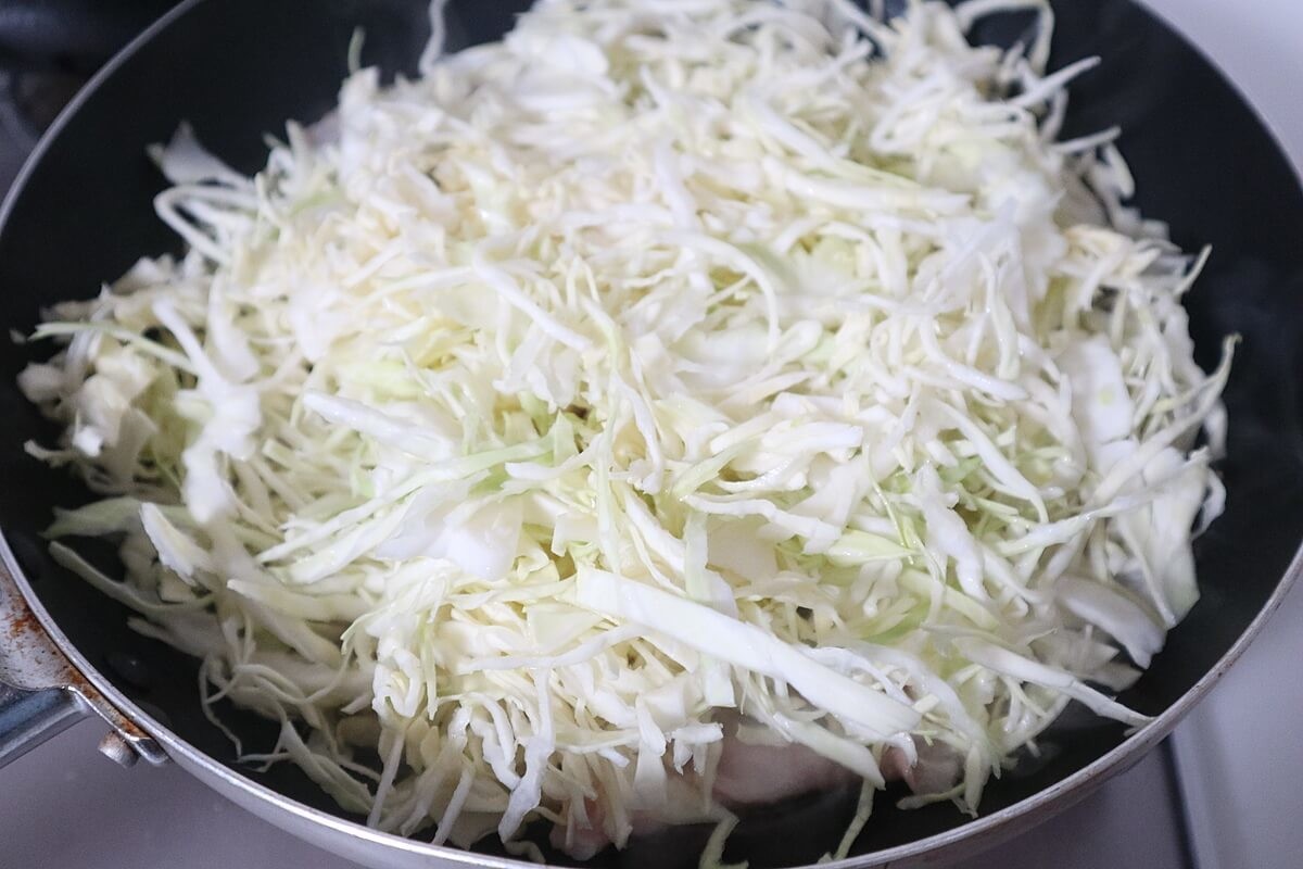 2、「1」の豚肉に火が通ったら、千切りキャベツをのせる。