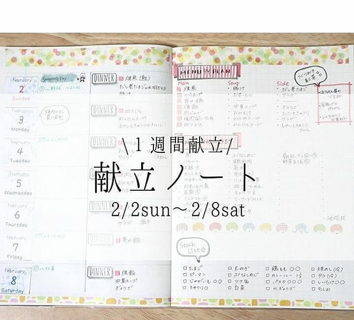 「料理が苦手なので、献立ノートを書いています。冷蔵庫の中の在庫を書き出し、1週間分の献立を先に決めてから、在庫では足りない物を買い物リストに記入。ムダな買い物をしないようにしています。