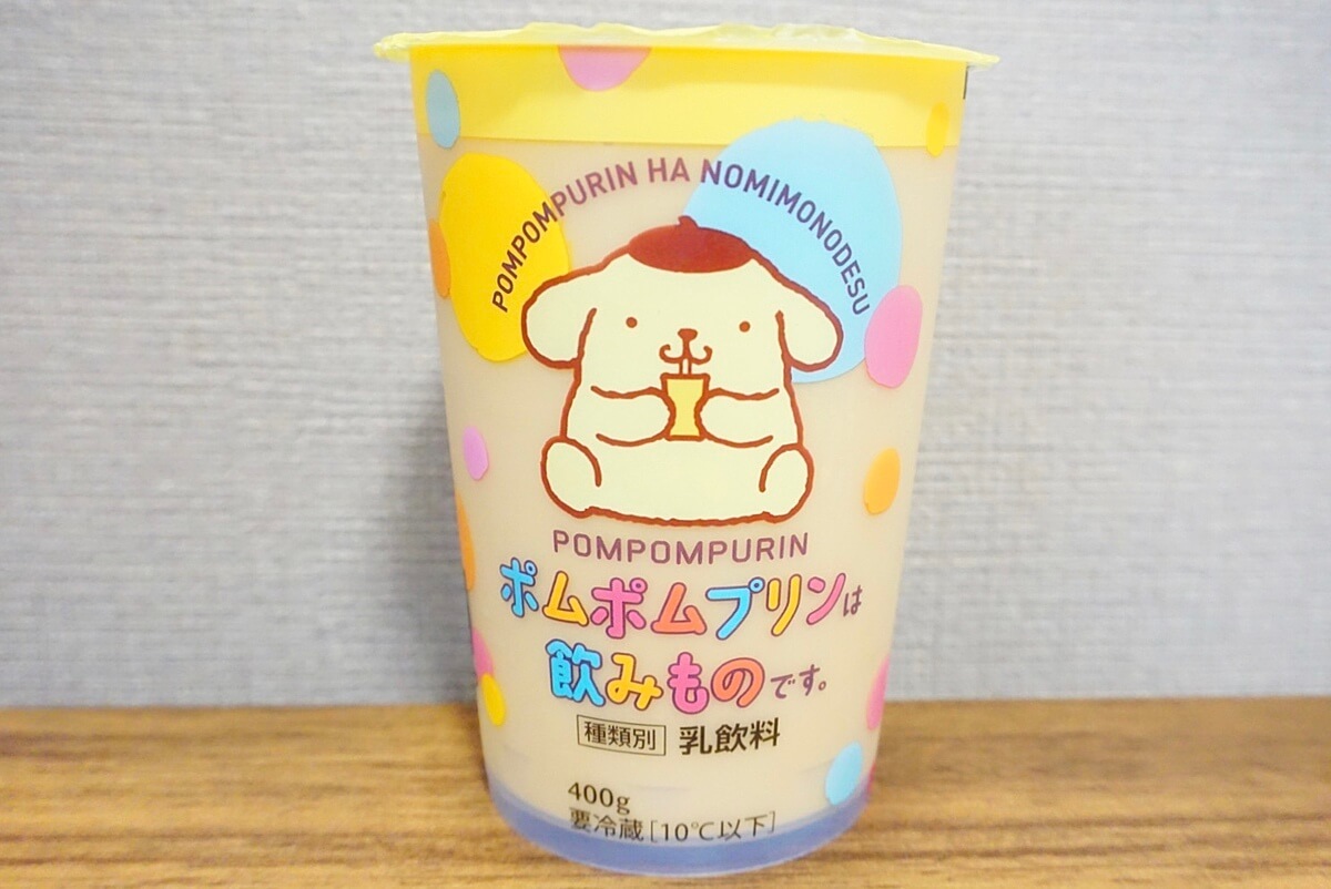 ファミマをパトロール中にドリンクコーナーで見つけたのは、サンリオの大人気キャラクター「ポムポムプリン」がひと際目立っていた「ポムポムプリンは飲み物です。」です。
