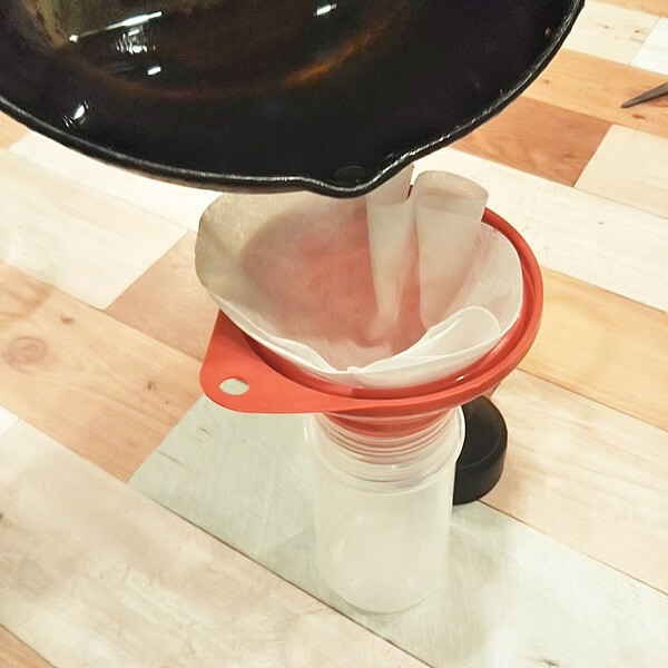 じょうごを差し込んで100円ショップの油こし紙を敷いて濾しています。