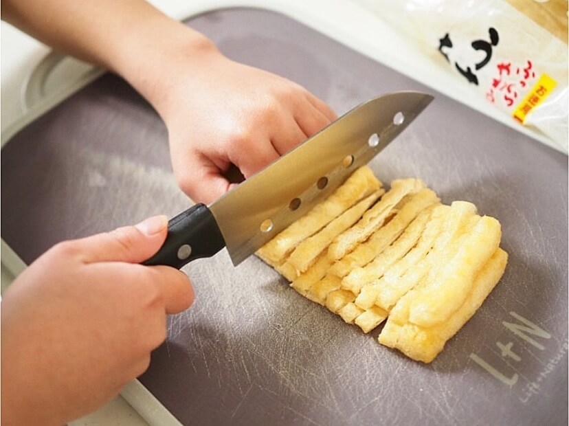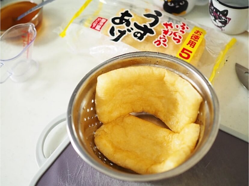 (1)油揚げ2枚にお湯をかけて、油抜きしておく