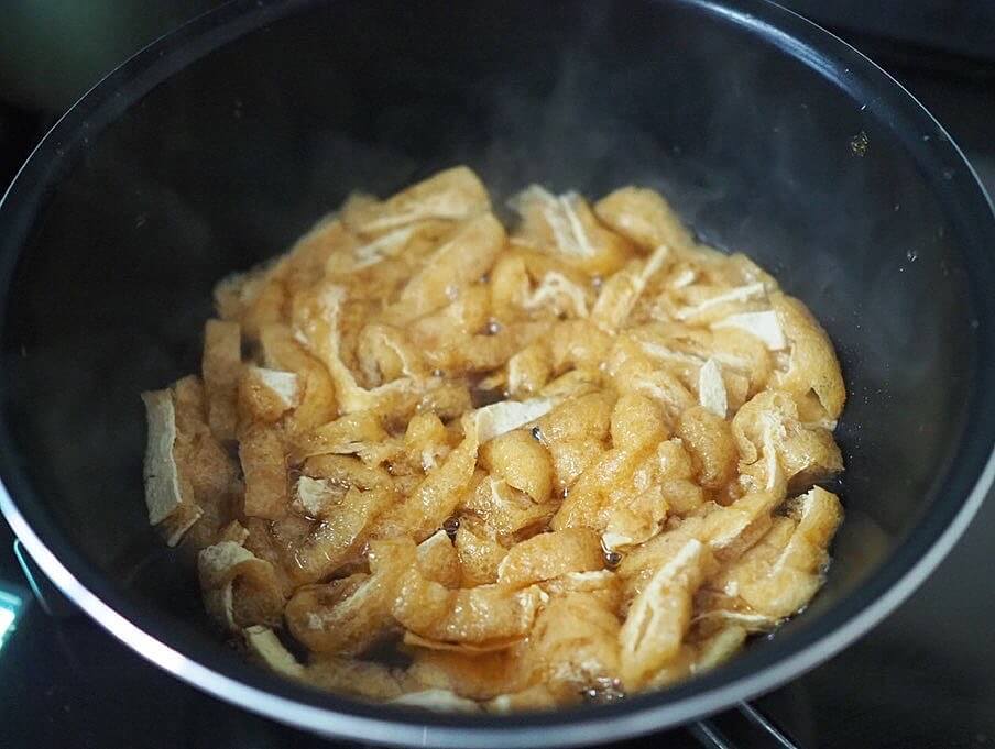 (3)鍋に油揚げ、水100cc、砂糖大さじ1、みりん大さじ1、醤油大さじ1を加え、弱火で煮汁がなくなるまで煮たら冷ましておく