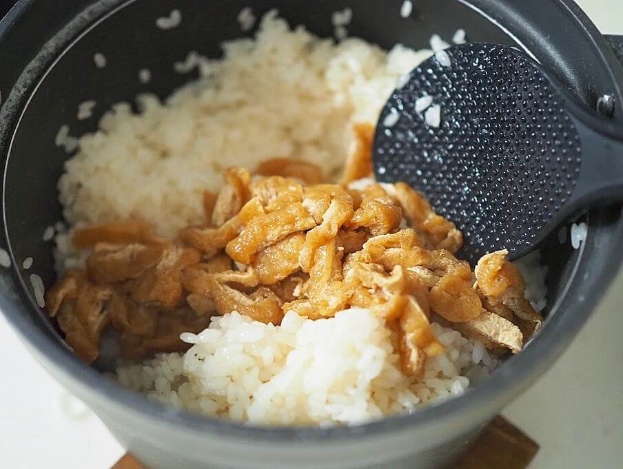 (4)炊けたご飯にすし酢を混ぜ、③の油揚げを混ぜ込めば完成。