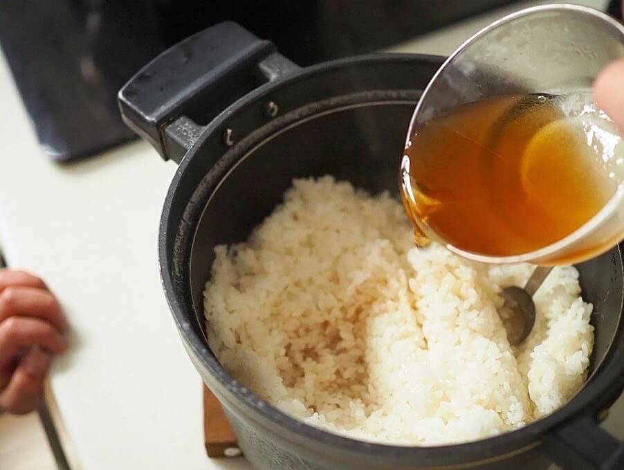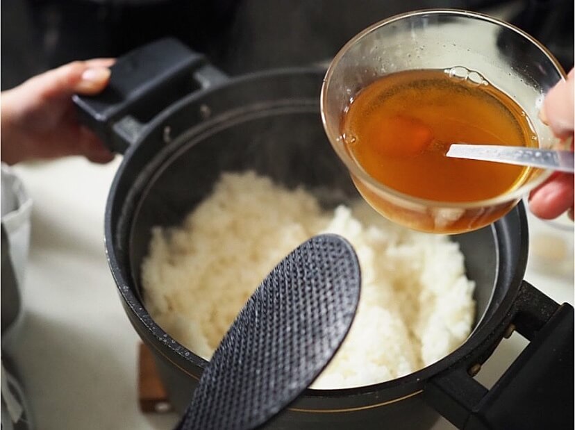 全ての材料を混ぜ合わせたすし酢を作っておき、炊きたてのごはんに加えて混ぜるだけ!