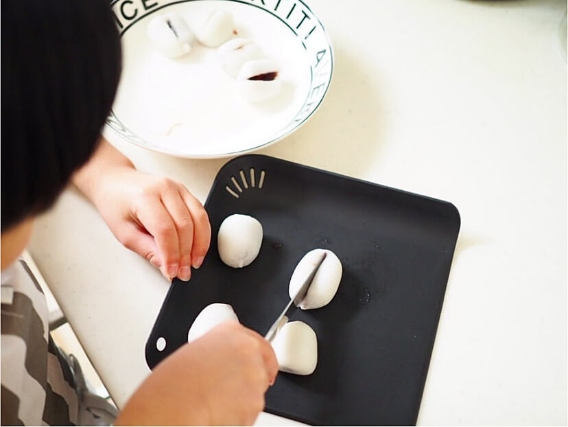 (1)ぷち大福を冷蔵庫もしくは常温で解凍してから、ナイフで大福に切り込みを入れる