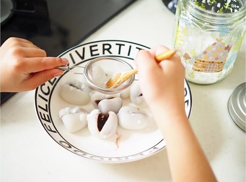 (2)粉ふるいで片栗粉を全体にまぶす(餅のベタつきが防止できます)