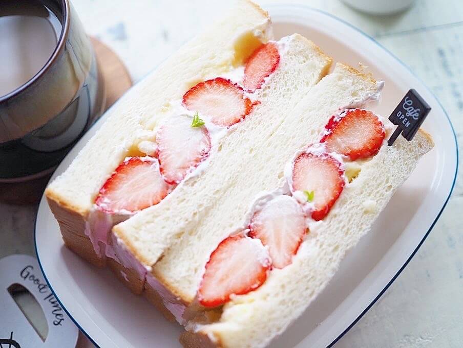 (3)食パンでサンドしたら、縦1列に並べたいちごの中心を切るようにカットする
