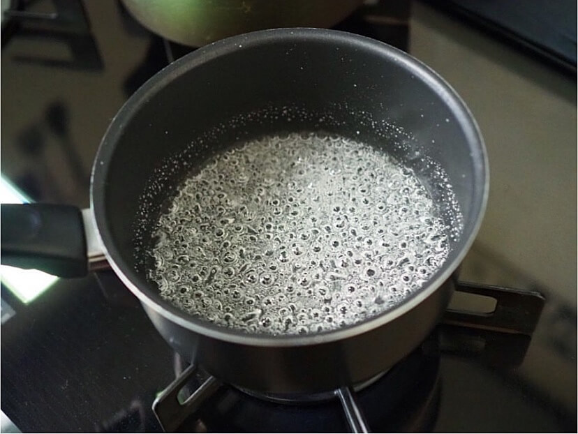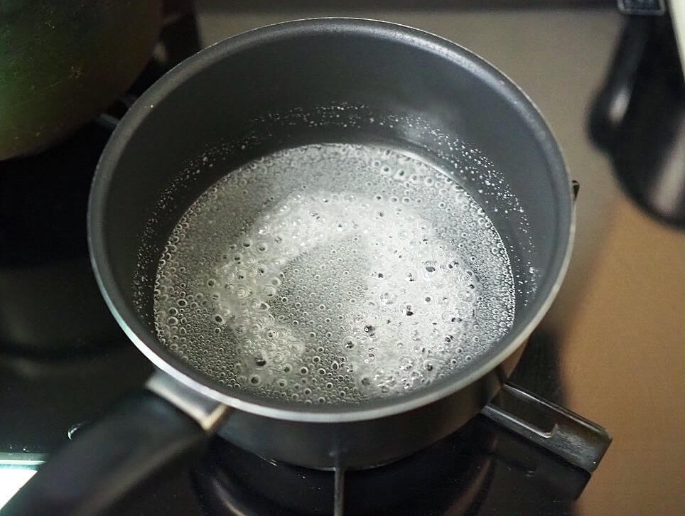 (2)砂糖と水をお鍋に入れてまぜ、砂糖が溶けたら火をつけて加熱する