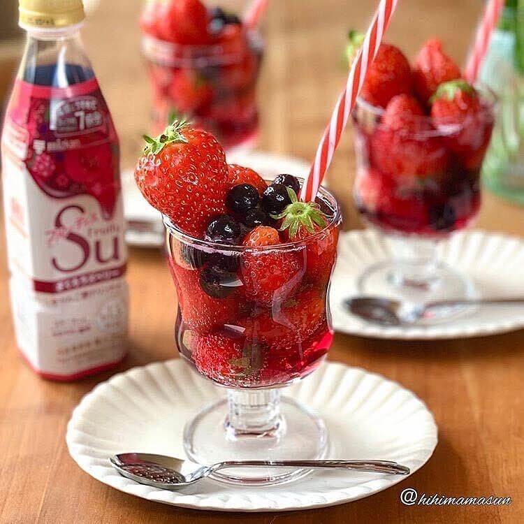 苺をヘタ付きのままよく洗います。ヘタを取ると苺の味が落ちてしまうので、そのままがおすすめ。その後、ブルーベリーと一緒に1~2時間ほど炭酸水と「フルーティス™」に漬けます。それを苺をかじったときに、シュワッとした食感がおもしろく、娘も喜んでいました。みかんなどもおすすめです。(@hihimamasunさん)