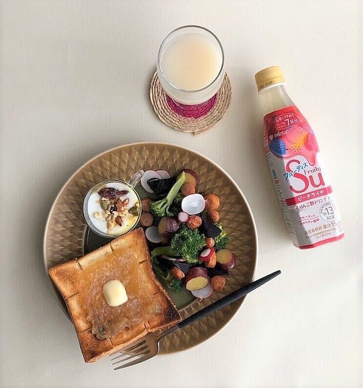 「もともと毎日お酢ドリンクを飲んでいました。でも、もっと楽しみながら飲みたいと思っていました。そんな時『フルーティス™』を知り、3種類のフレーバーと朝食との相性を考えるようになったんです」と@panna_cotta.703さん。