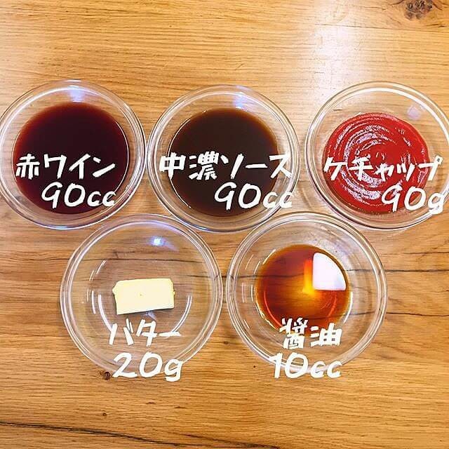 - ハンバーグを焼いたフライパンの余分な脂を取り除き赤ワイン、ケチャップ、中濃ソース、バターを入れアルコール分が飛ぶまで温める。