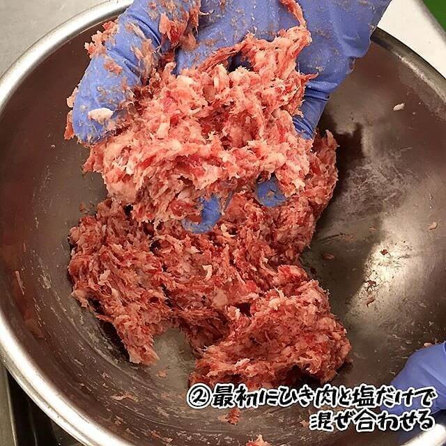 ② 最初にお肉と塩のみで糸が引くまで混ぜ合わせる。
