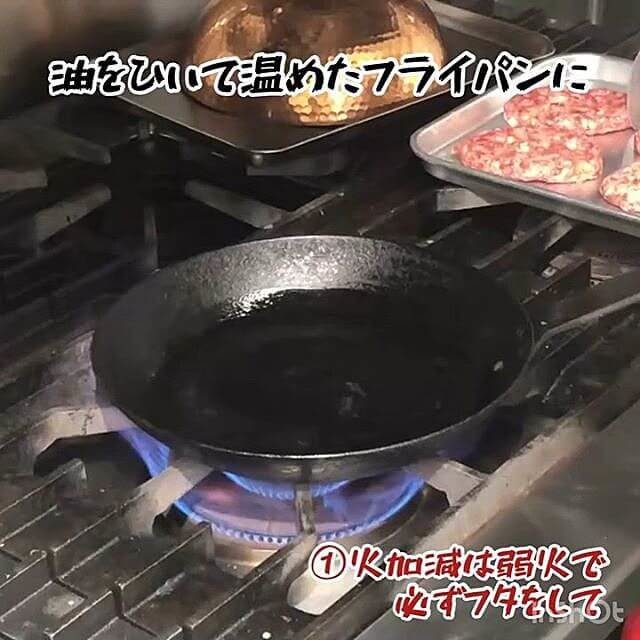 - 熱したフライパンにサラダ油を引き、パテをのせ蓋をして弱火で4分半焼く。