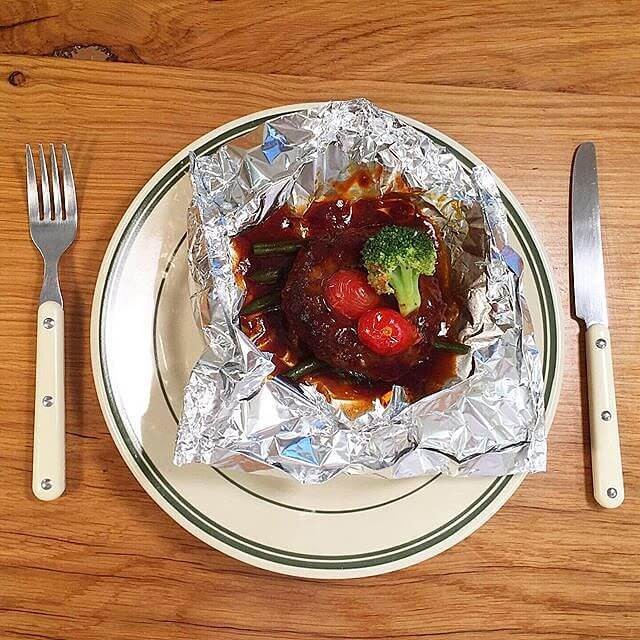 - 45cmに切ったアルミホイルにハンバーグとお好みのお野菜を乗せる。(今回はプチトマト、ボイルしたインゲン、ブロッコリー)