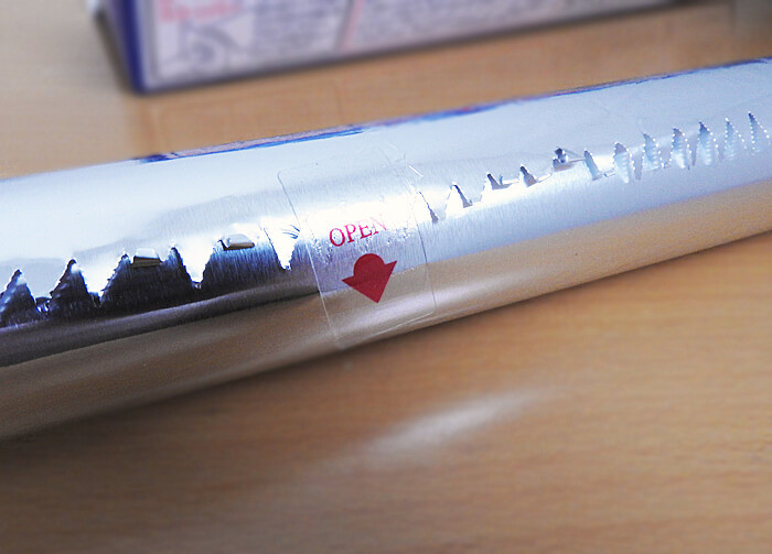 業務スーパーのアルミホイルは、少し強度が足りないかな……と思いました。というのも、アルミホイル中央部分に「OPEN」と記載させている透明シールをはがす際に、必ずと言っていいほどアルミホイルがやぶけてしまうからです。