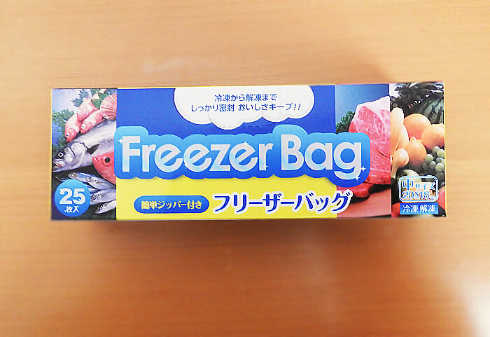 食材の冷凍保存や子どもが外出用お菓子入れなどに使える「フリーザーバッグ」。今回私が購入した業務スーパー「フリーザーバッグ」は中サイズ(20cm×18cm)25枚入りで97円(税抜)です。