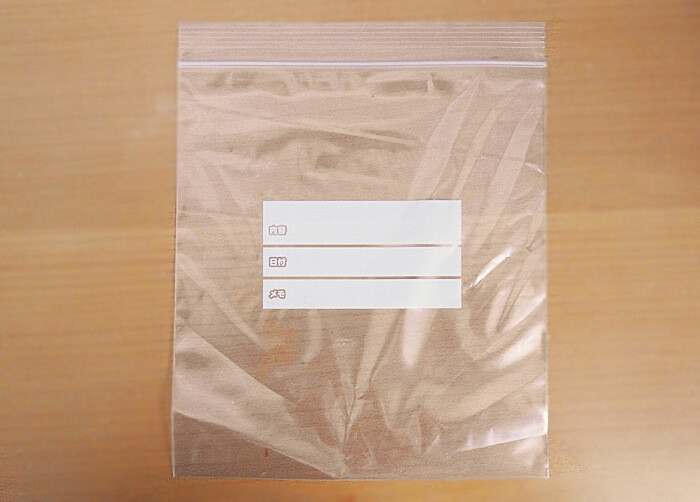 業務スーパー「フリーザーバッグ」には、内容・日付・メモ欄があります。他メーカーの類似品と似てますね。耐冷温度は−20℃となっていますので、冷凍保存しても問題なし。