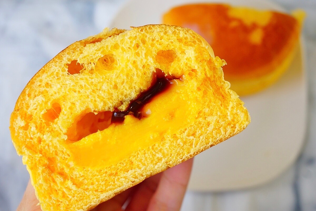かぼちゃ味の生地に、かぼちゃプリン味のクリームとカラメル風味のソースが入ったパンです。